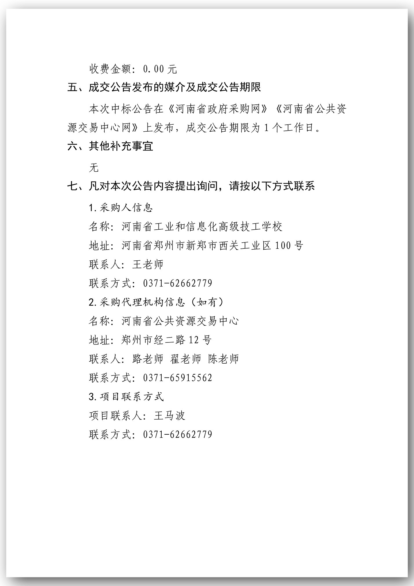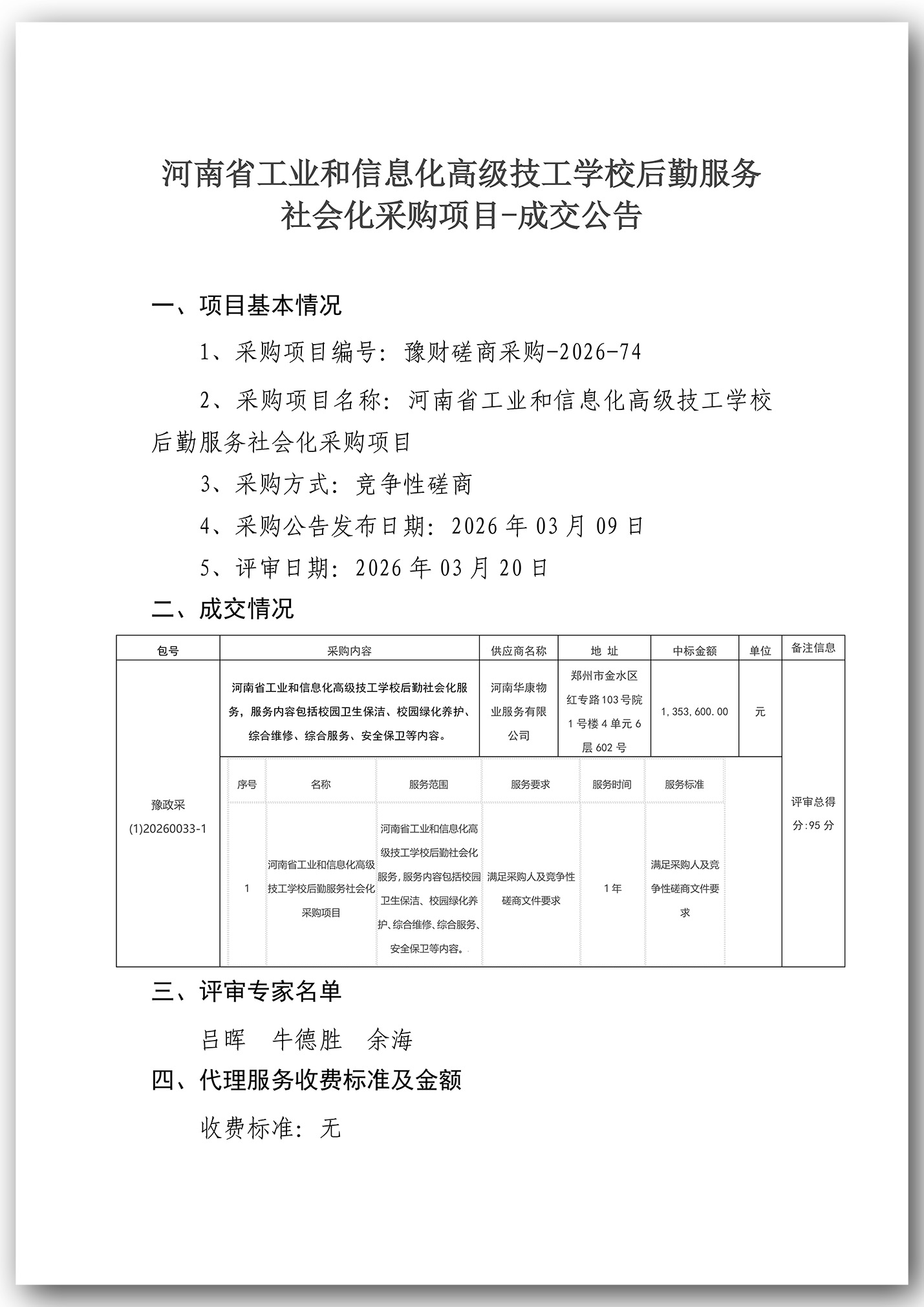 河南省工业和信息化高级技工学校后勤服务社会化采购项目-成交公告