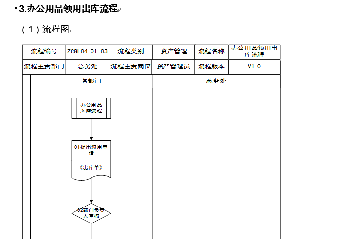 资产管理分为办公用品管理、固定资产管理、无形资产管理、机动车辆管理、国有资产产权管理和国有资产年度报告编报。办公用品管理分为办公用品购置、入库、领用出库等环节;固定资产管理分为固定资产购置计划编制、购置申请、领用、内部转移、维修、处置和清查盘点等环节;机动车辆管理分为公务活动车辆租赁、用车申请和维修等环节;国有资产产权管理分为国有资产产权登记/变更/撤销等环节。